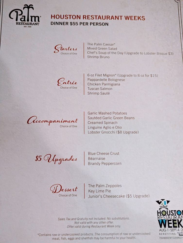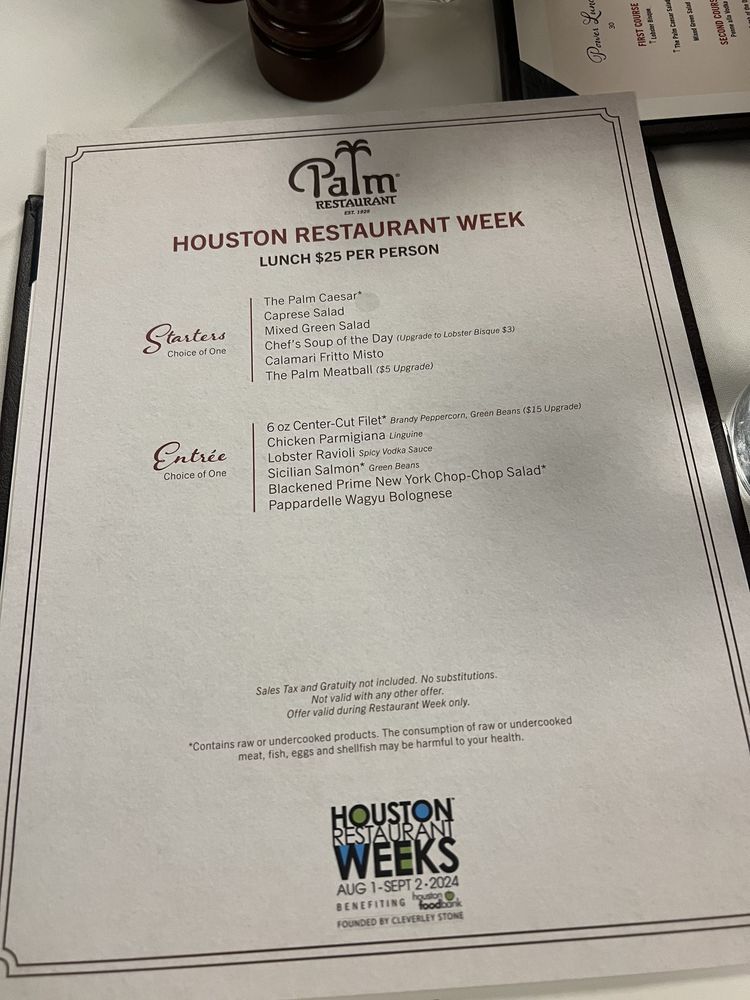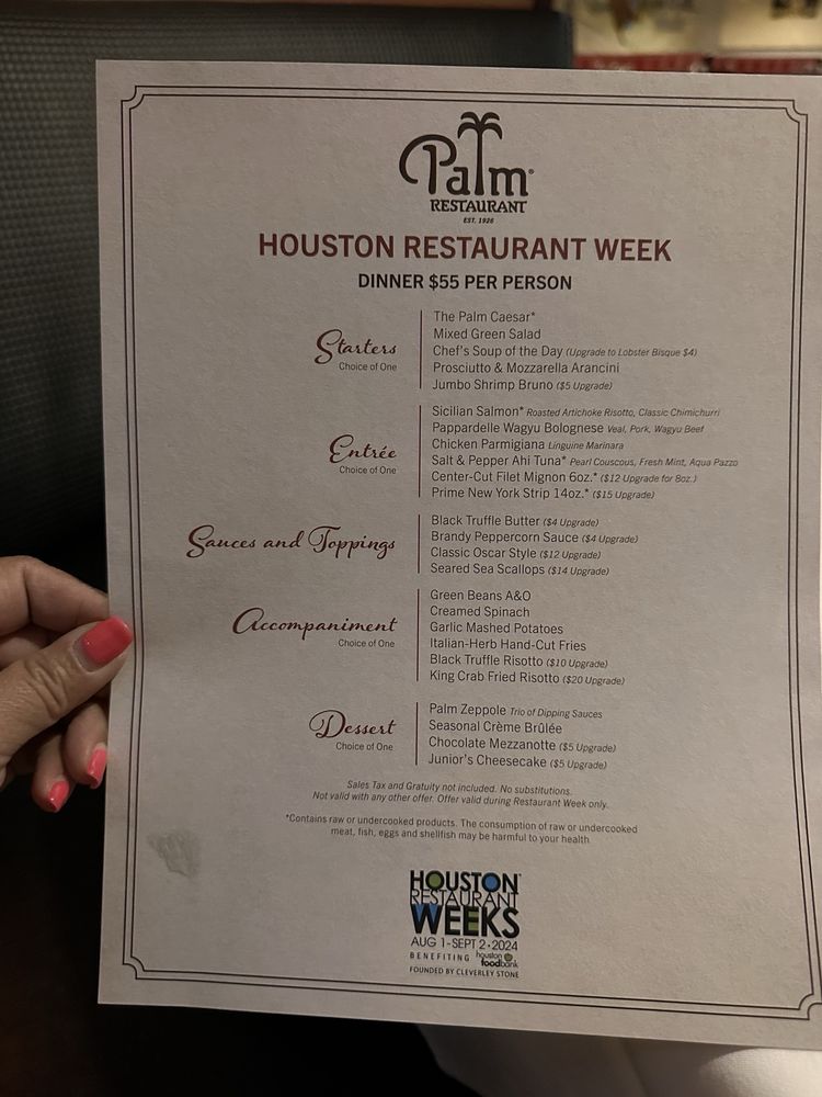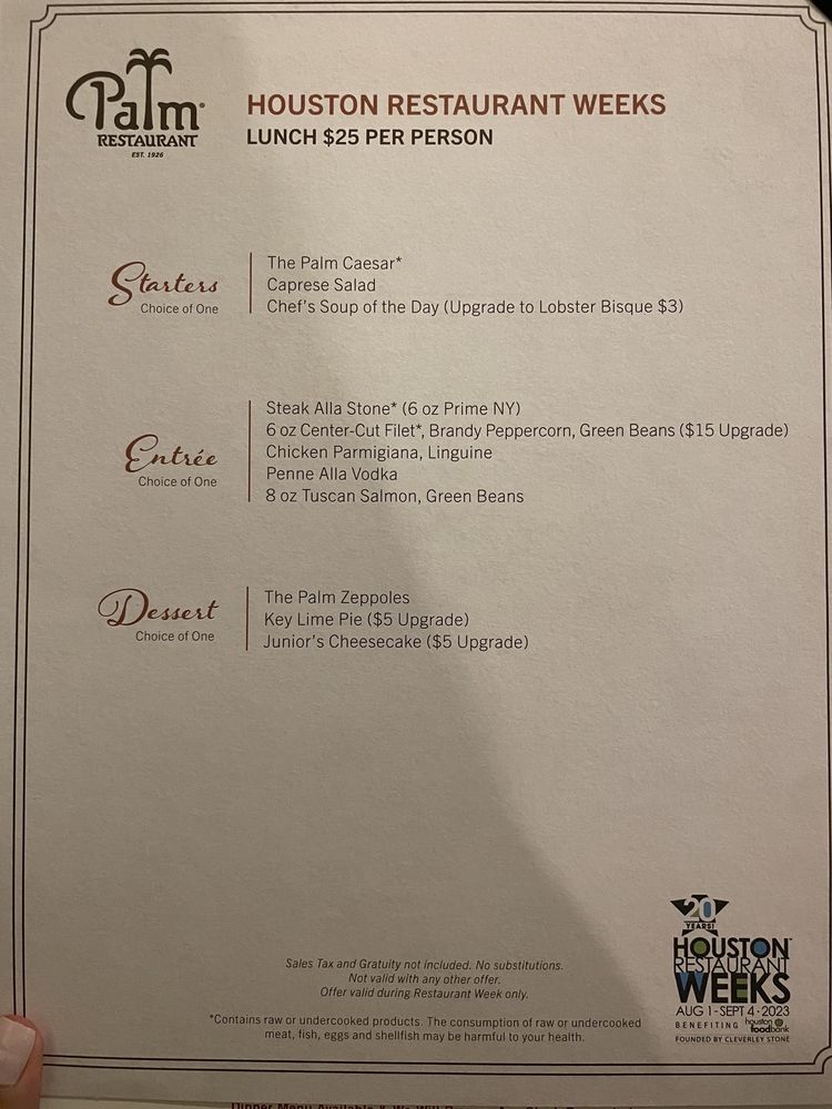 Introducing the menu at The Palm - Downtown Houston, a classy steakhouse and seafood restaurant located at 1201 Fannin Ste 129 Houston, TX 77002. With a variety of starters, such as Jumbo Shrimp Cocktail and Seared Scallops, and mouth-watering salads like the Steakhouse Wedge and The Palm Mixed Green Salad, there is something for everyone. Don't miss out on their Prime New York Strip and Boneless Ribeye Steak for a truly satisfying experience. Customers rave about the delicious dishes, attentive service, and elegant ambiance. Make sure to try their signature Lobster Bisque and NY Cheesecake with Raspberry Syrup for a memorable dining experience. The Palm - Downtown Houston is a must-visit for those looking for a top-notch dining experience in the heart of the city.